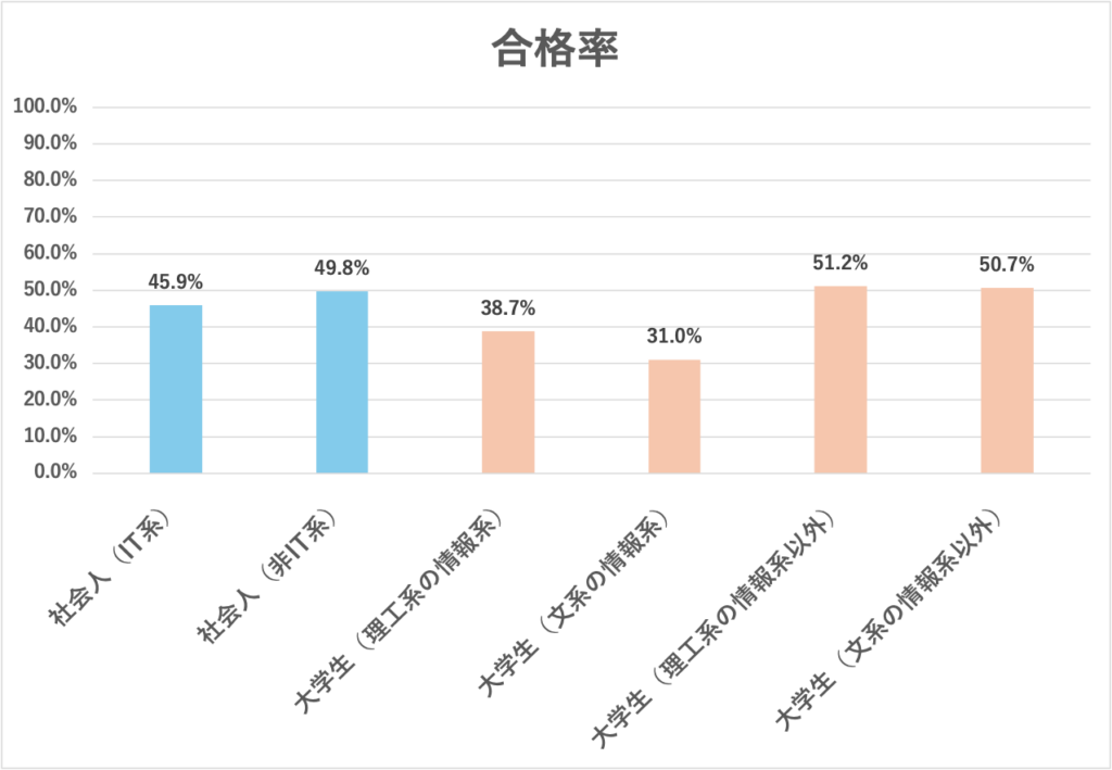 な、なんと!IT系が合格率を引っ張っていると予想していましたが、非IT系のほうが高いようです。そして大学生では情報系以外のほうが合格率が高いという傾向がありました。これはかなり面白い結果ですね。