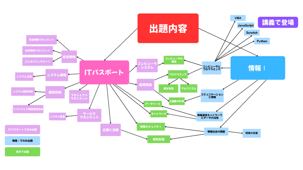 それぞれの出題範囲を独自にマインドマップ化してみました。図中にも凡例を示しましたが、ピンク色がITパスポート青色が情報Ⅰ緑色が両方で出題される範囲です。
